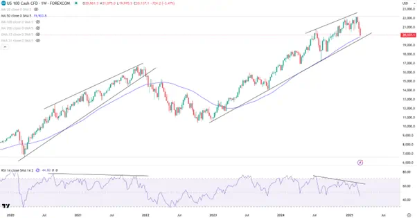 纳斯达克指数首先要考验也是需要守住的是趋势线在19800点附近的支撑。日内级别存在超卖迹象可能短暂止跌,但目前的宏观环境和市场信心很难真正刺激股指持续反弹。长期趋势线和均线一旦失守,恐迎来更大幅度的下跌。